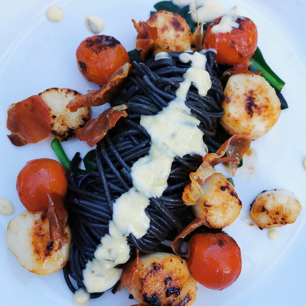 Inktpasta met coquilles, serranoham, lamsoor, en sabayon