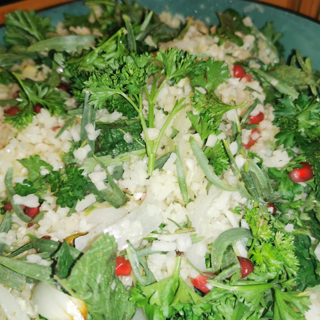 - Meng de bloemkoolrijst met de verse kruiden, pistache noten, komijn, citroensap, granaatappelpitten.