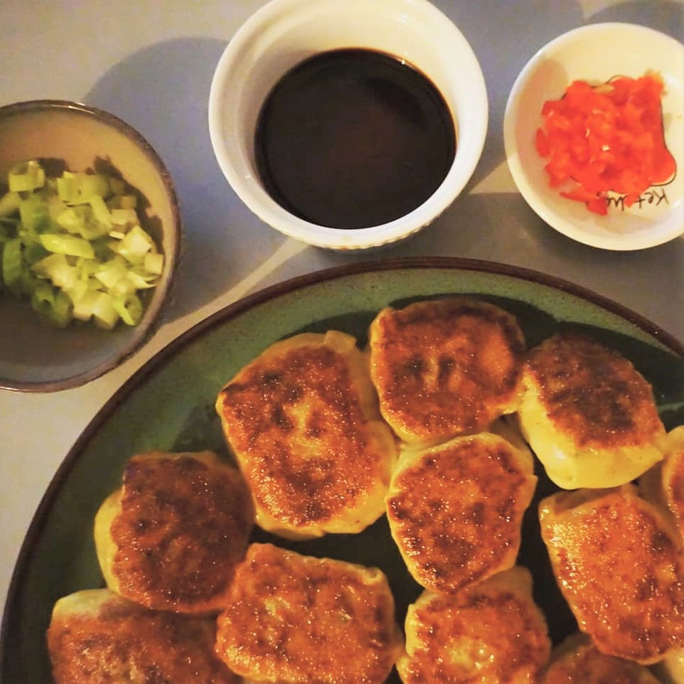 - Als ze krokant zijn leg een bord op de dumplings en draai in geheel met de pan om.
