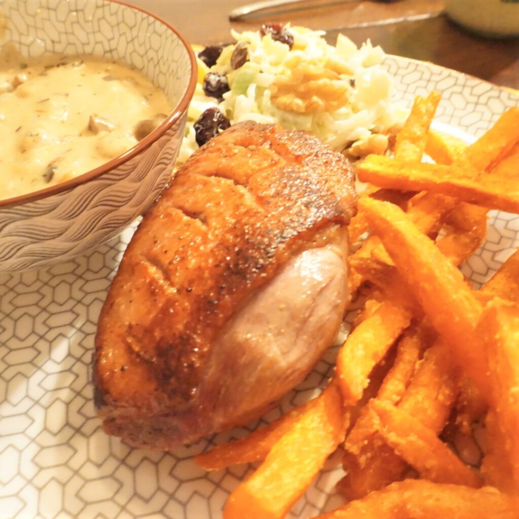 Eendenborst met champignonroomsaus en zoete aardappelfrietjes