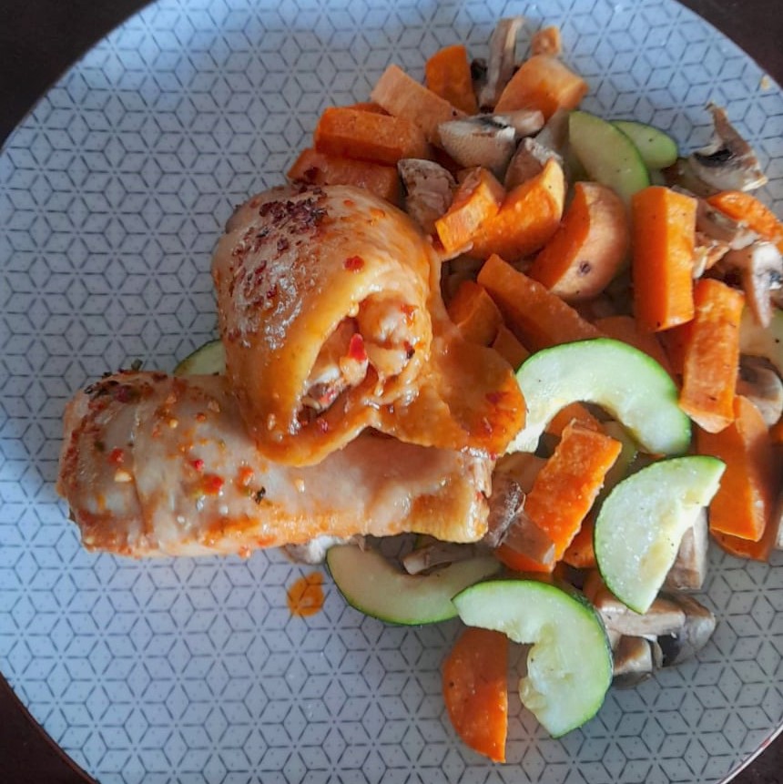 Heb je nou geen kip in huis of liever iets anders? Een gelijk recept hebben we ook met brie of met vis. Het leuke is dat dit gerecht kan met heel veel groenten die over zijn. Zoete aardappel, pompoen, prei, venkel, broccoli, noem het maar op.