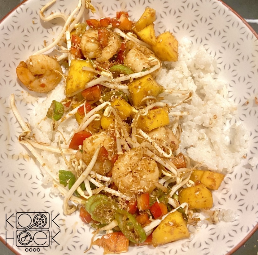 7. Serveer de rijst met daarop de 'salade', top af met de kokos rasp.