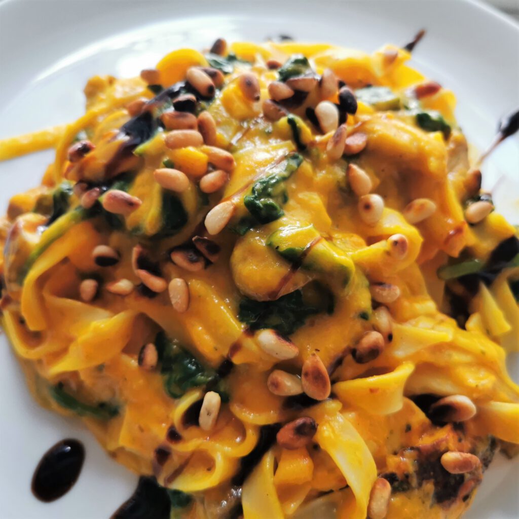 Pasta met pompoensaus, paddestoelen, en spinazie (super herfstig, super lekker)