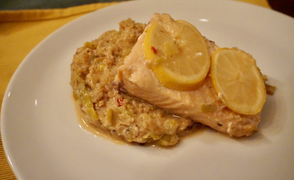 - Als de quinoa gaar is, leg de bedekte vis bovenop en laat dit op de stoof mee garen.