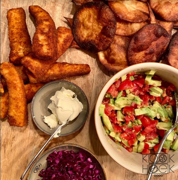 - Wij hebben de tortilla's uitgestoken tot kleintjes en deze gefrituurd, je kan ze ook groot laten, in de pan bakken of evt gewoon alleen even opwarmen in de magnetron. Up to you!